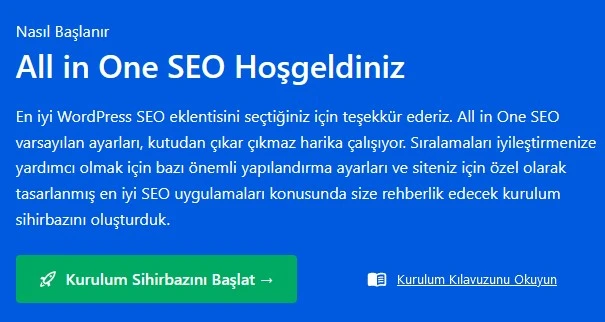 Kurulum sonra WP Admin panelinizde bulunan All in One SEO menüsüne giriş yapıp Kurulum Sihirbazını Başlat butonuna tıklayarak sitenin genel ayarlarını yapabilirisiniz.
