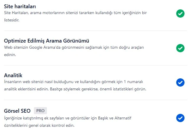 Örneğin, Analytics ve Site Haritası kullanmak istiyorsanız bu bölümde aktif ya da deaktif edebilirsiniz.
