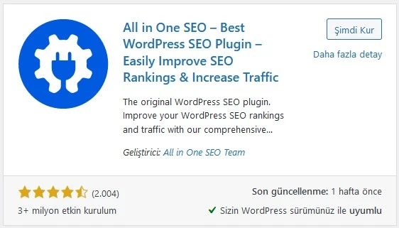 Aktif olarak 3 milyondan fazla Wordpress tabanlı sitede kurulu olan All In One SEO Pack toplamda 35 milyondan fazla indirme almış ve genel puanı 5 üzerinden 4.6 puana sahiptir.