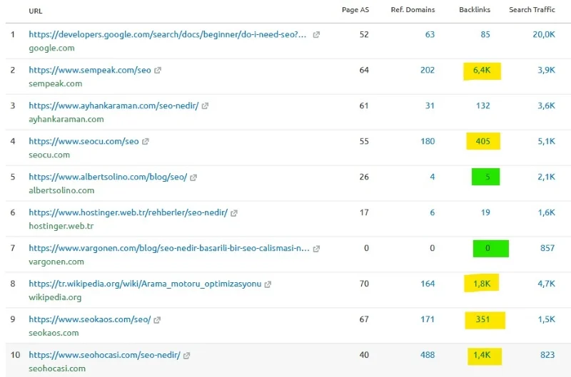 İlk 10’da bulunan sayfaların toplam kaç backlinke sahip olduğu ve hatta bu backlinklerin kaç farklı domainden geldiğine bakın.