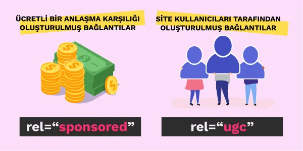 Forum siteleri ya da yorum yapılan sitelerde ziyaretçiler de link ekleyebiliyorsa, rel=“ugc” etiketi bu linklere otomatik olarak eklenmelidir.