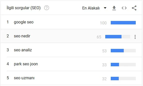 Google Trends kullanarak aradığınız sorgu ile Google’ın bağdaştırdığı diğer kelimeleri de tespit edebilirsiniz. Bunun için bakmanız gereken tek yer sorguyu arattıktan sonra sağ altta çıkan “İlgili sorgular” bölümüdür.