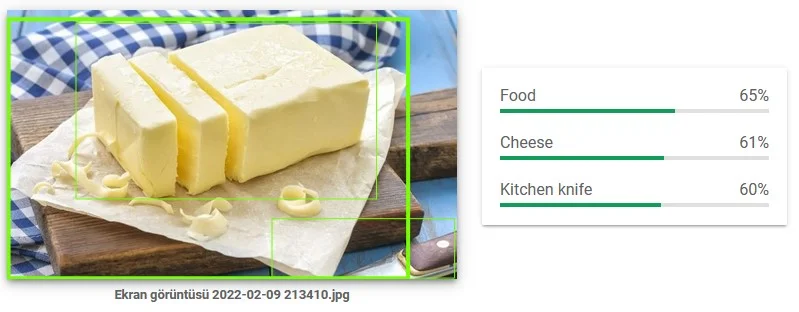 Bu çalışmada, Google’a ait olan ve makine öğrenmesi temelli görsel tanımlama aracı olan Cloud Vision API’ye margarin fotoğrafı yükleniyor ve nesnenin ne olduğuyla ilgili rapor alınıyor. Sonuç olarak, Google bu fotoğrafın büyük oranla peynir olduğunu düşünüyor.