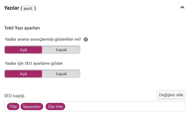 Ancak bu ayarları blog içerikleriniz yani yazılarınız için yapmak istiyorsanız; İçerik Türleri sekmesinin altında bulunan “Yazılar” alanını kullanmanız gerekiyor.